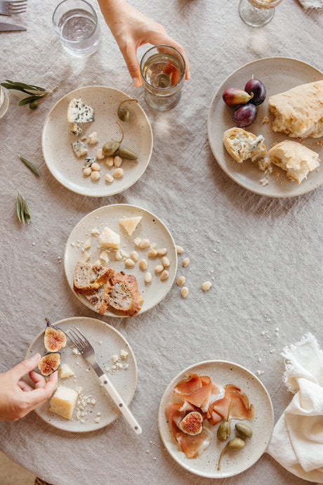 Inspired by Malibu's rocky canyons, these bread plates are kiln-fired at high temperatures for durability. The tops and bottoms are glazed in matte speckled white with grey undertones.